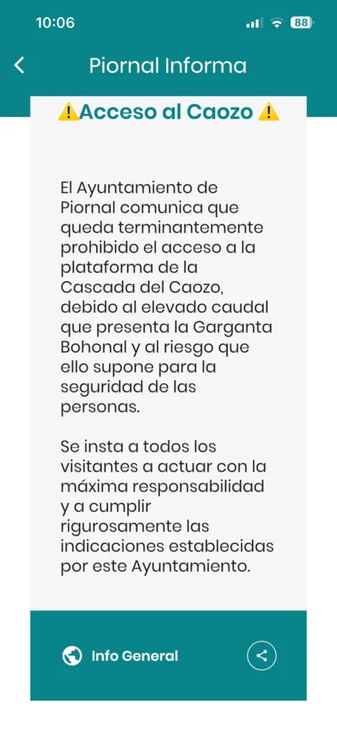 El Ayuntamiento de Piornal ha emitido un aviso oficial en el que queda terminantemente prohibido el acceso a la plataforma de la Cascada del Caozo. Esta medida responde al elevado caudal de agua que presenta actualmente la Garganta Bohonal, una situación que supone un riesgo real para la seguridad de las personas.