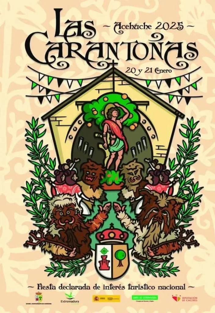 En honor a San Sebastián, patrón de Acehúche, los hombres del pueblo se transforman en «carantoñas», vistiendo pieles de animales y portando máscaras grotescas adornadas con dientes, orejas y elementos como pimientos secos, que acentúan su aspecto intimidante.