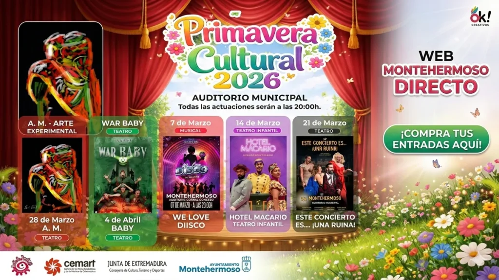 Descubre la programación de la Primavera Cultural 2026 en Montehermoso. Teatro, musicales y espectáculos infantiles del 7 de marzo al 4 de abril. ¡No te lo pierdas!