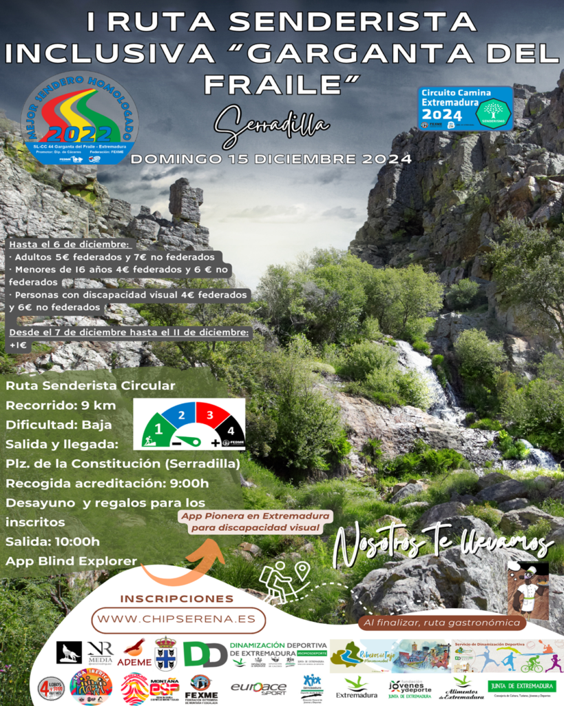 La I Ruta Senderista Inclusiva Garganta del Fraile es mucho más que una actividad deportiva, es una oportunidad de disfrutar de la naturaleza y de la cultura, sin barreras. Te esperamos el domingo 15 de diciembre de 2024 en Serradilla para compartir una jornada inolvidable en el corazón del Parque Nacional de Monfragüe.